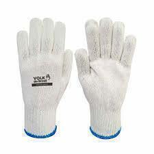 Luva de segurança confeccionada em fibras naturais e fibras sintéticas (poliéster), punho com inserção de fibras elásticas, acabamento em fibras sintéticas.