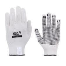 Luva de segurança tricotada em fibras naturais e fibras sintéticas, 7 gauge, pigmentos em PVC na palma, punho com fibras elásticas e acabamento em fibras sintéticas.